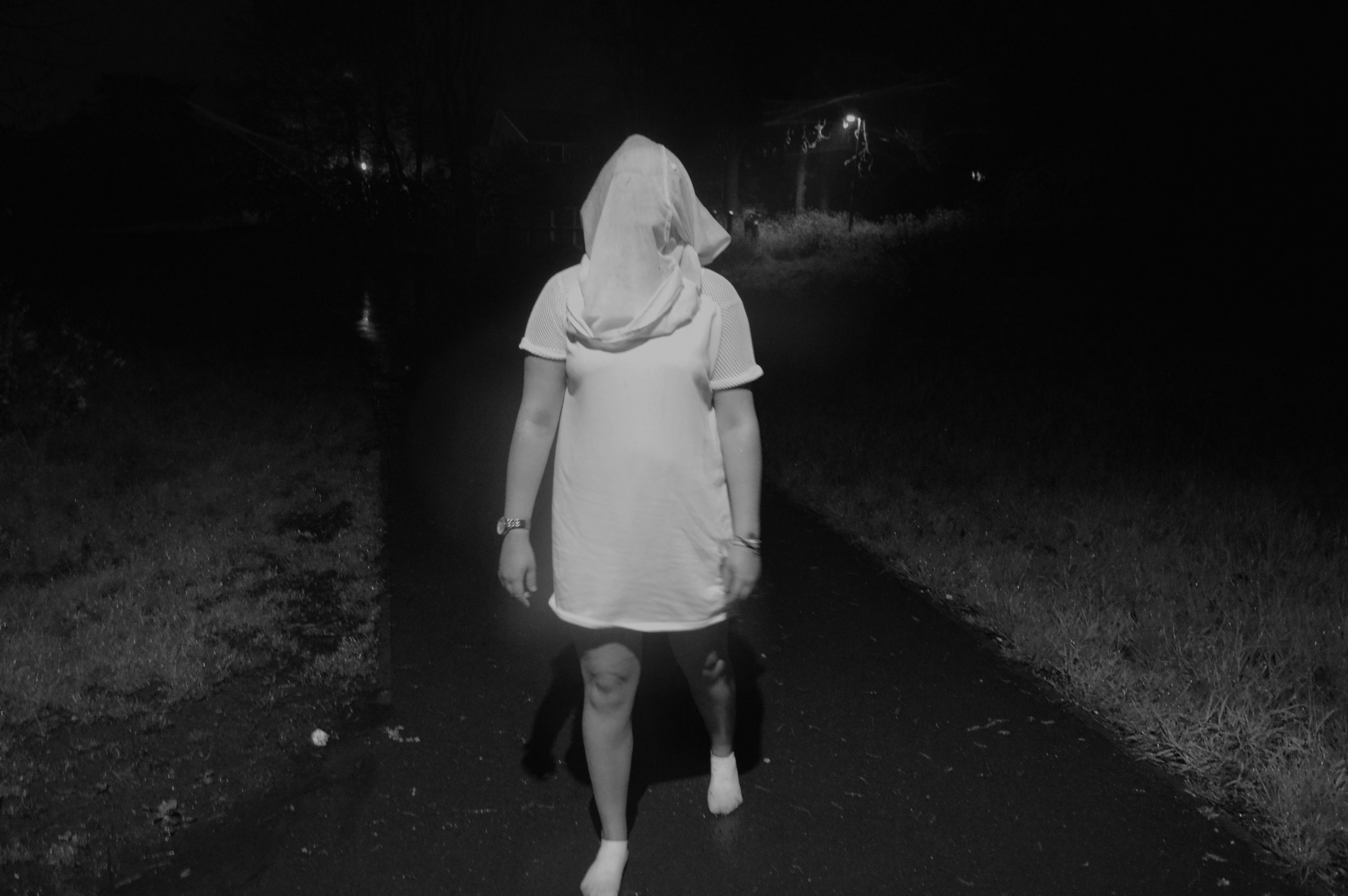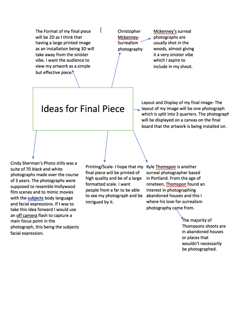 These two photographs were the most successful from the shoot. I used an off camera flash to capture the images quite raw and gritty. I have taken inspiration from Mckenney by using a female subject but keeping the face anonymous with the use of a pillow case. The shoot was taken in some local woods close to my home as I wanted to incorporate the surrealism and have an element of the images still being rather sinister. In the top image the rain droplets were unintentional. However, I like the effect it has on the image adding a more of an eery and scary effect. If I was to do this shoot again I would take more close ups of the subject, this would add more effect to the image and intrigued the audience even more as there is no context to the image and the identity of the person is unknown.
