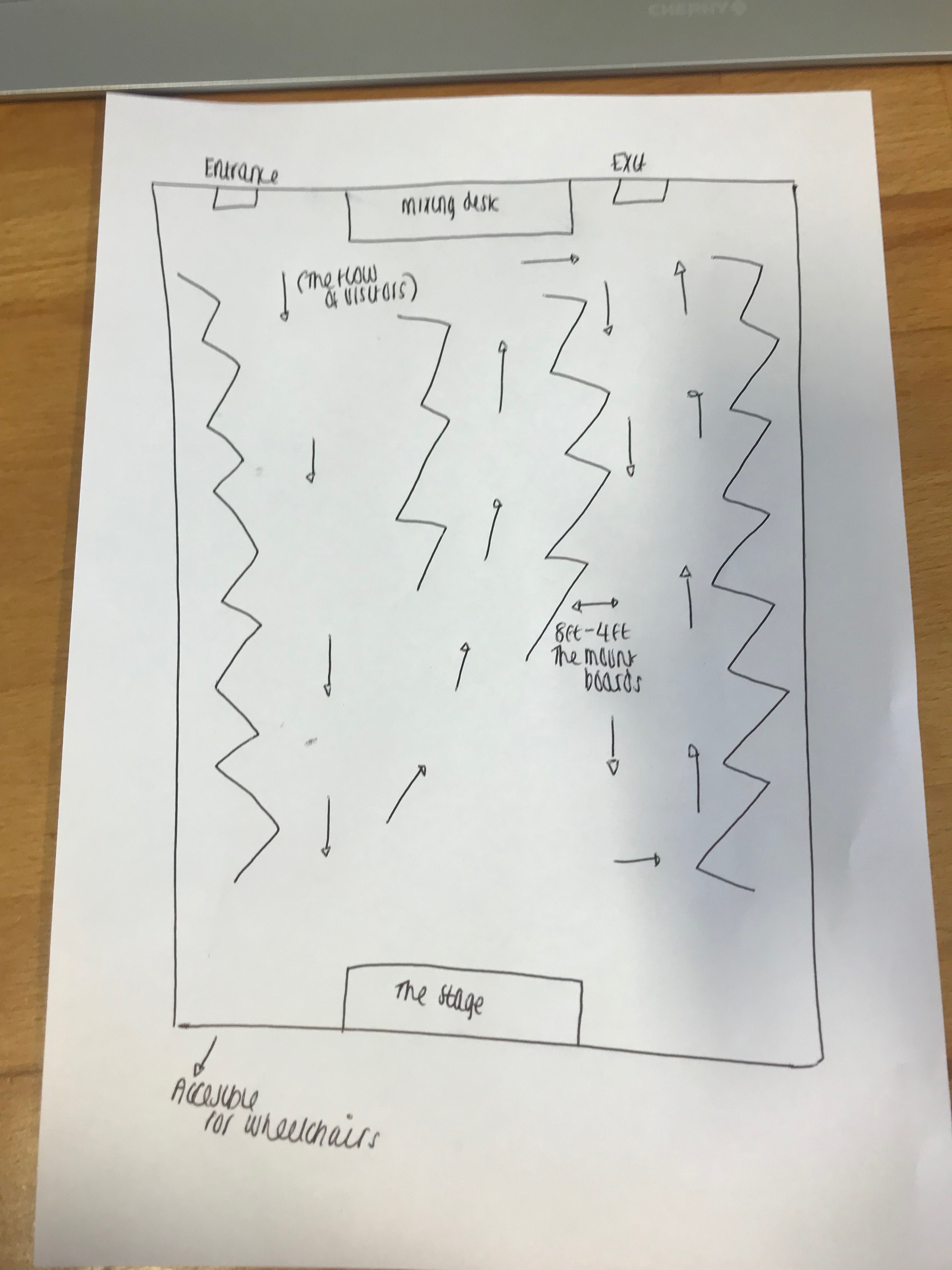 Ultimately, college is in charge of the planning towards the exhibition. There are 3 floors in total open for the work being shown in the exhibition with arrow systems to aid with crowding. The work created by the students will be presented on mount boards (MDF). The boards are 8ft X 4ft and the work itself can come in various sizes. The students are responsible for the installation of their work and how they display it. The technicians and staff will be there to help supervise the installation of the work. The space of the actual exhibition is restricted, the doors must be clear enabling people to enter and exit. Lighting in the rooms will be on but may be switched off depending on how the students work is installed ( eg. installation).